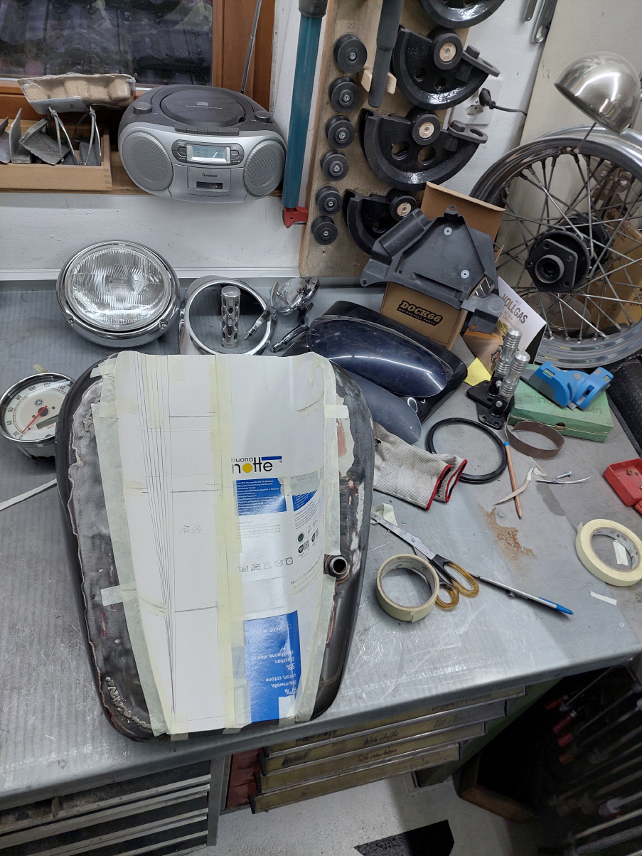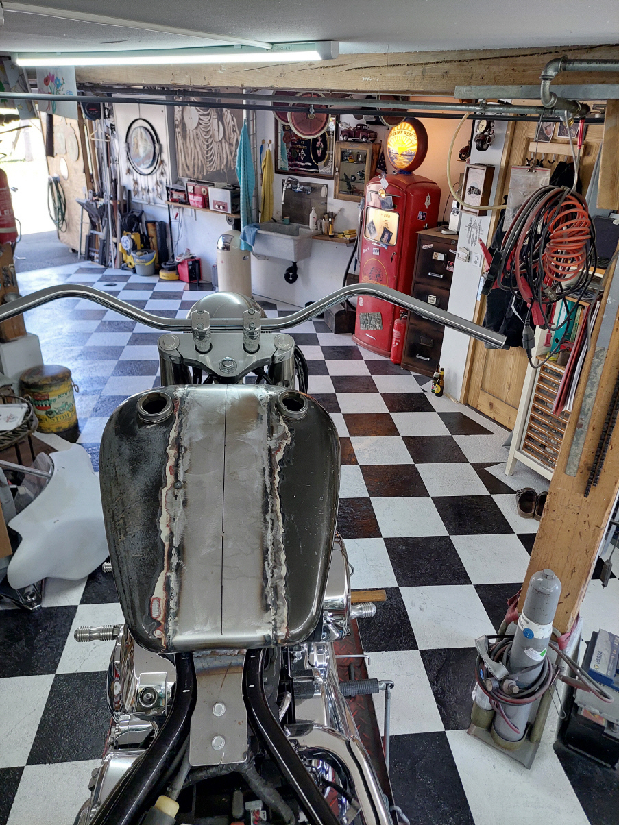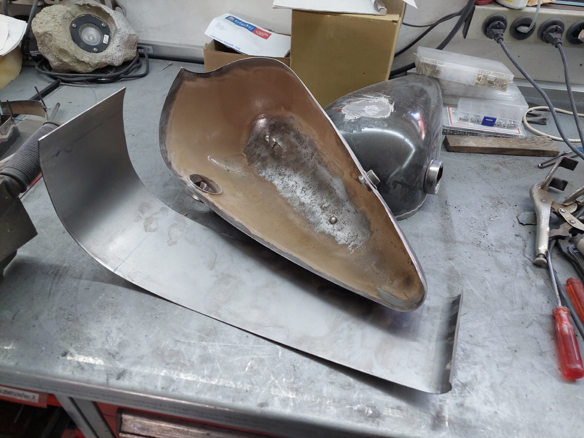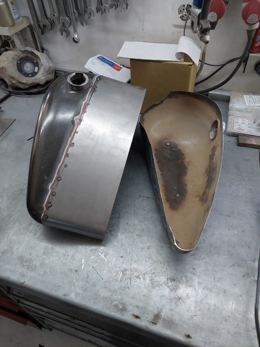 Ich beginne mit dem Tank Wenn der Tank geändert wird, veränderst du das gesamte Bike. Es ist auf den ersten Blick nicht mehr zu erkennen um welches Basisbike es sich handelt. Aus diesem Grund werde ich auch hier einen anderern Tank verbauen. Ich verwende einen alten Harley Tank, etwa jahrgang 73. Die zwei Hälften werden geöffnet und dann mit einem 14cm breiten Blechstreifen zusammen gefügt. Danach gehts ans Tunnel.