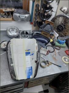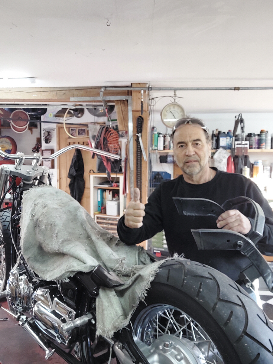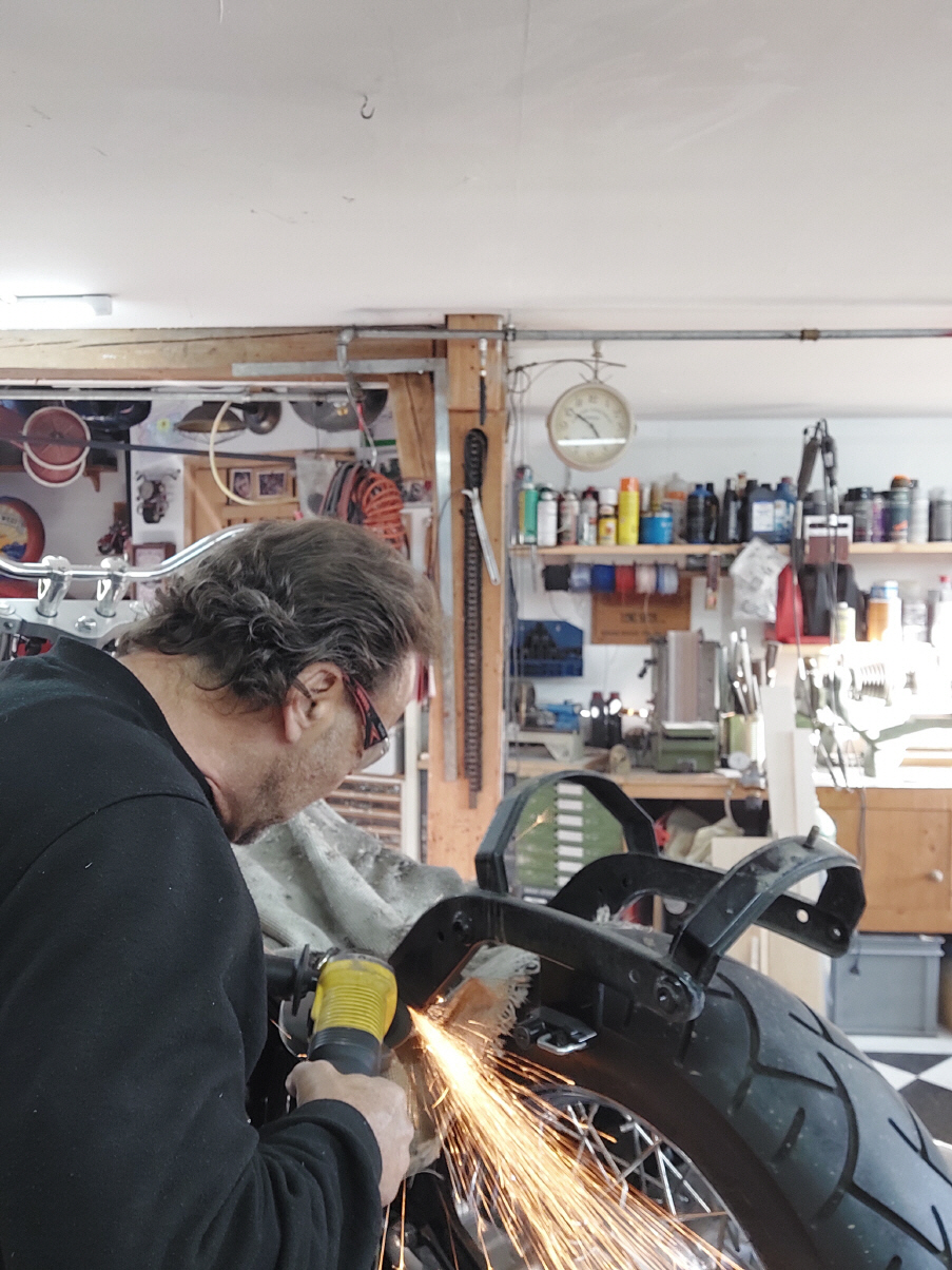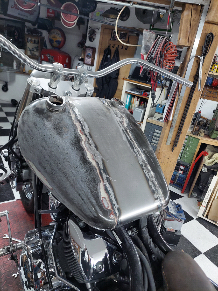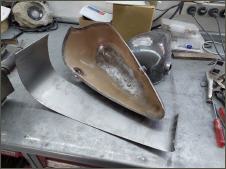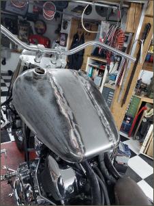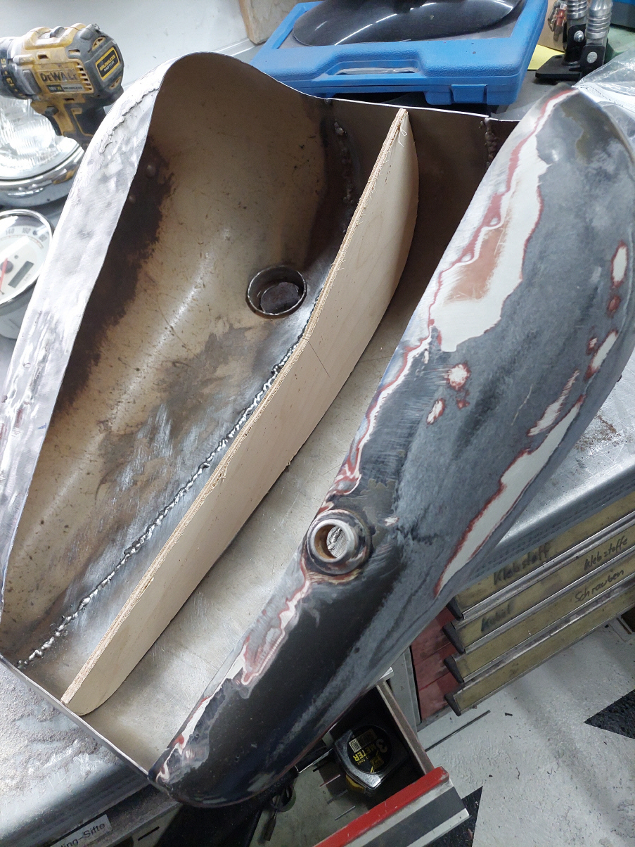 Ich beginne mit dem Tank Wenn der Tank geändert wird, veränderst du das gesamte Bike. Es ist auf den ersten Blick nicht mehr zu erkennen um welches Basisbike es sich handelt. Aus diesem Grund werde ich auch hier einen anderern Tank verbauen. Ich verwende einen alten Harley Tank, etwa jahrgang 73. Die zwei Hälften werden geöffnet und dann mit einem 14cm breiten Blechstreifen zusammen gefügt. Danach gehts ans Tunnel.