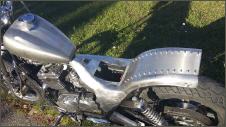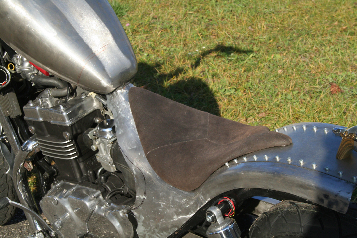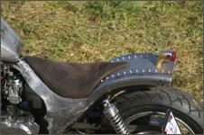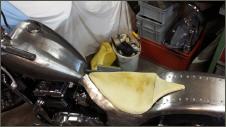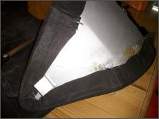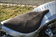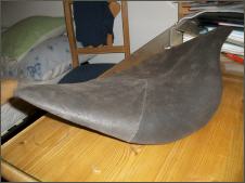 | Aus einem alten Ledermantel (Neupreis Fr.600.-) fertige ich mir einen Überzug. Da die Lederteile alle zu klein sind, mache ich einfach aus drei Einzelteilen die passende Grösse. Bevor der Lderanzug auf den Sattel kommt, belege ich den Schaumstoff mit Flies. Dies habe ich zuvor auf eine Baustelle mitgehen lassen. Dann wird der Bezug ganzflächig aufgeklebt. Der Sattel sit super geworden - keine Falte. Es klappt immer besser - ein Meisterwerk. Hurrrrraaa. |   |