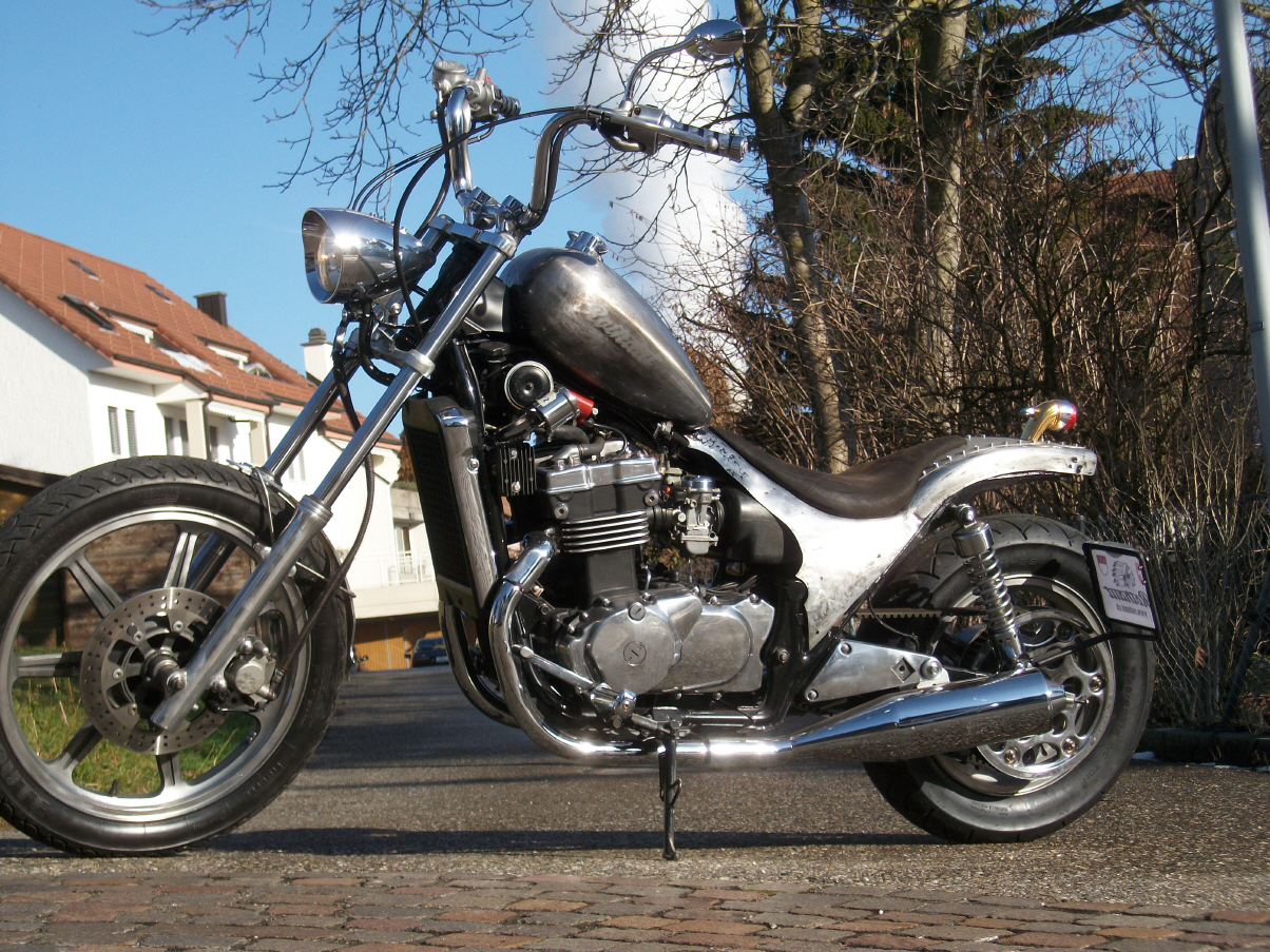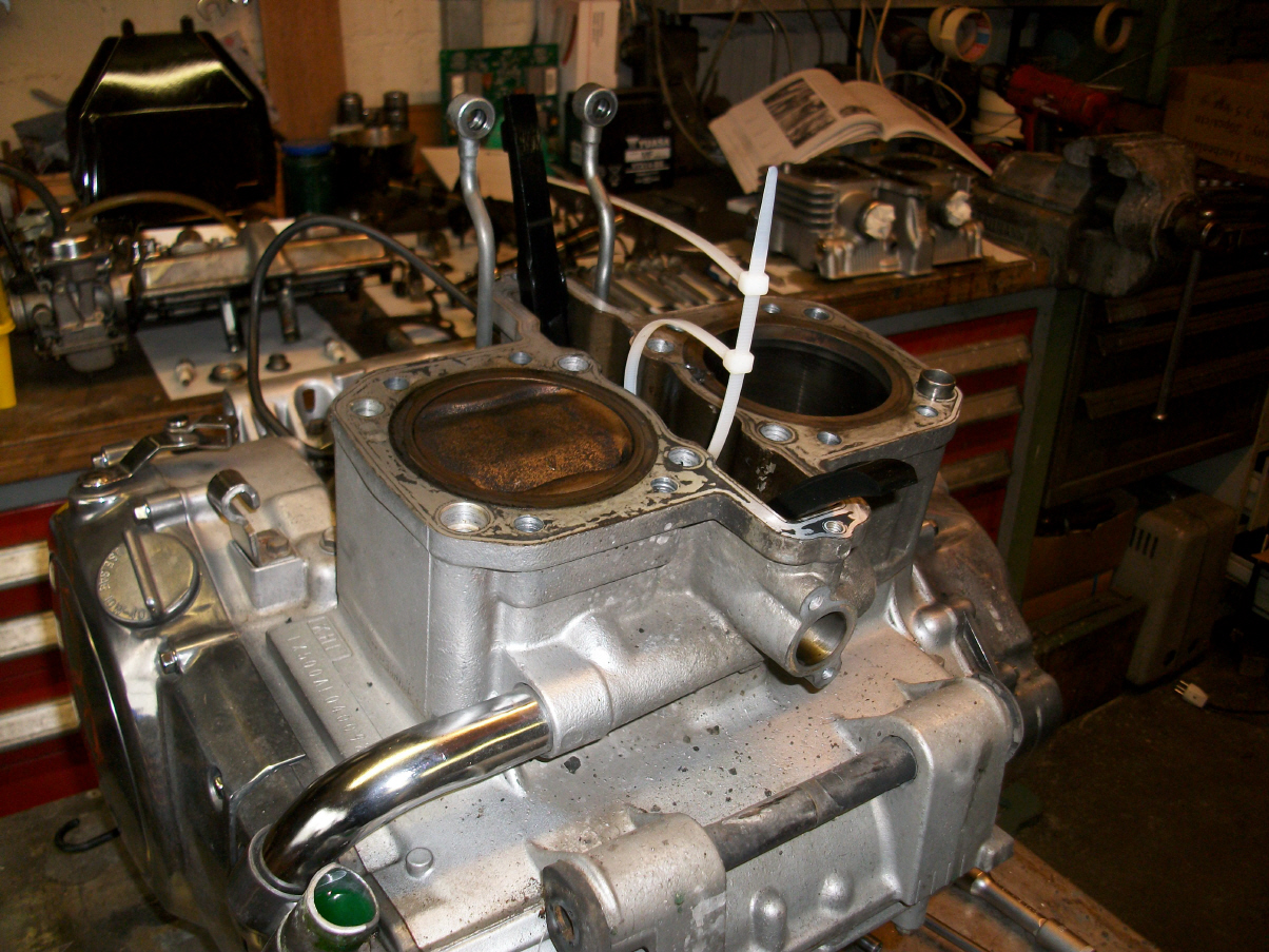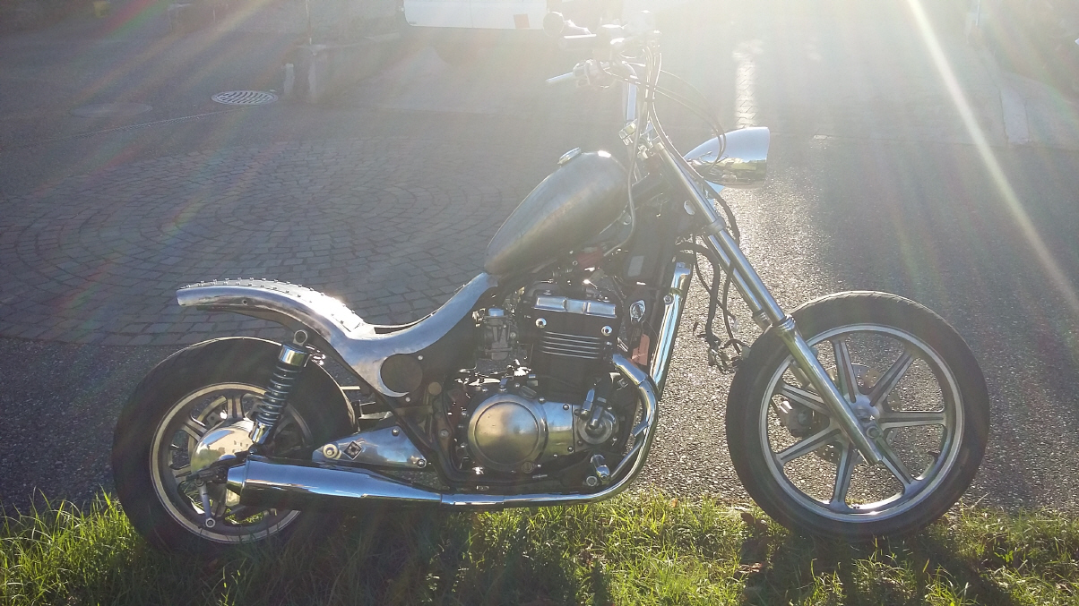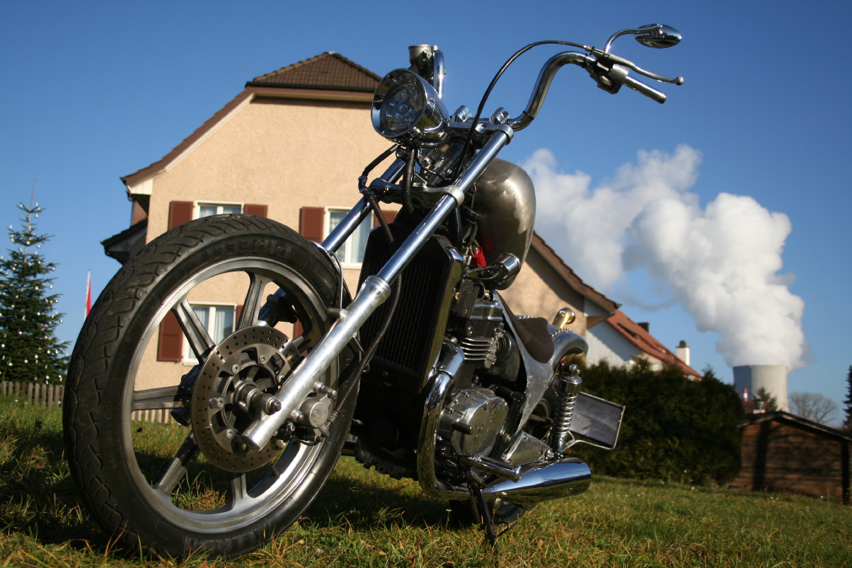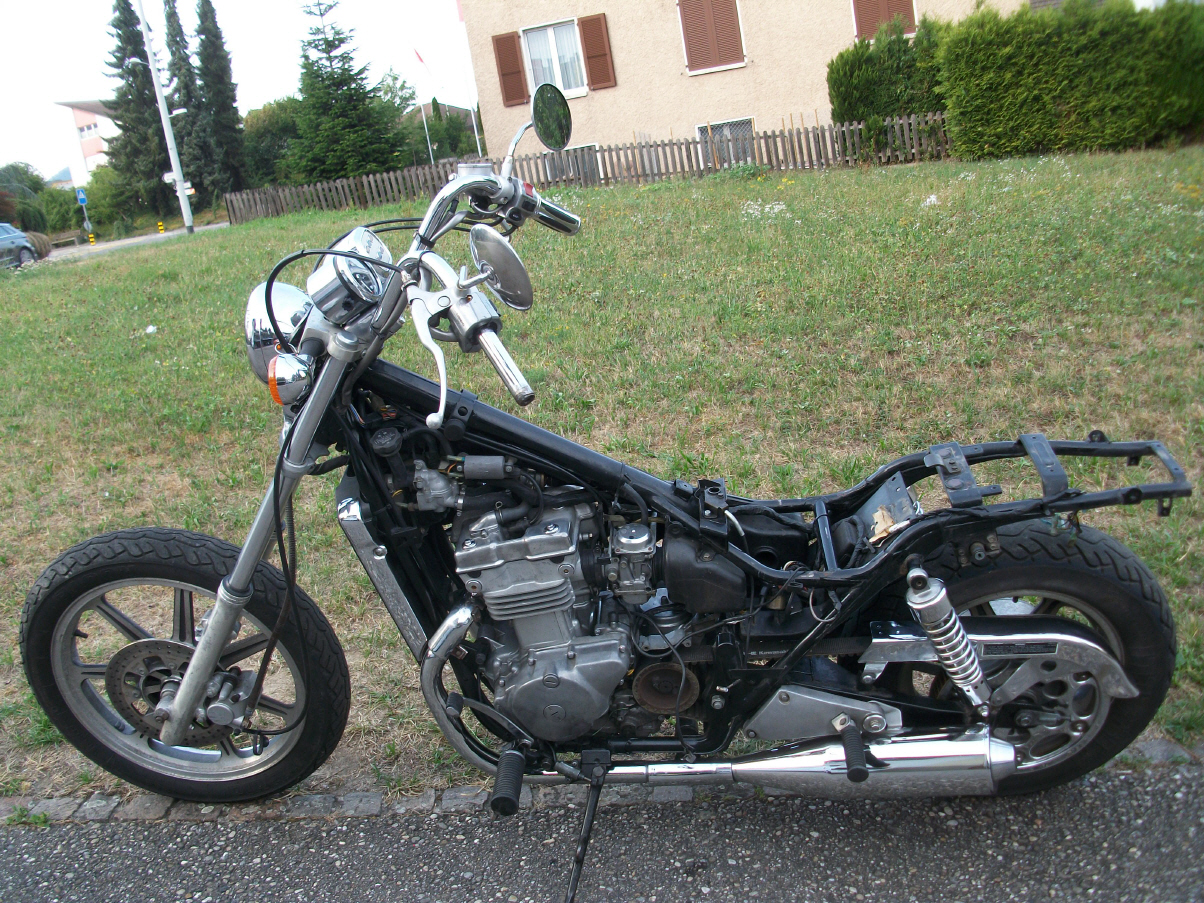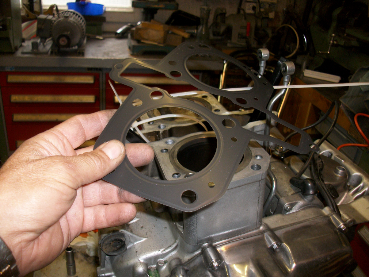 |   | Nun widme ich mich der Technik. Bevor ein Umbau realisiert wird muss da Bike technisch i.o. sein, sonst ist die Enttäuschung nacher gross wenn der Bock nicht richtig läuft und Du hast so viel Arbeit investiert. Erster Schritt, die Kopfdichtung. Die Kawa hat beim Testlauf ziemlich viel weissen Rauch abgesondert. Hab die ganze Nachbarschaft eingenebelt. Also muss die Kopfdichtung ersetzt werden.