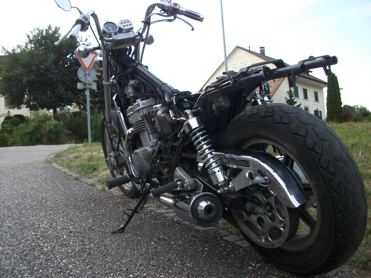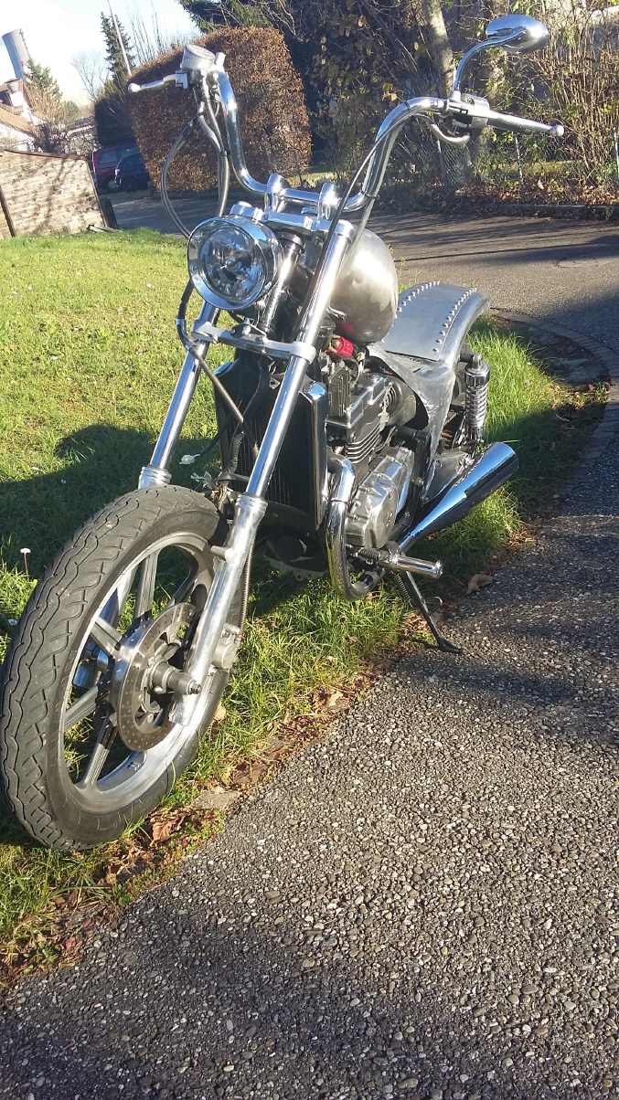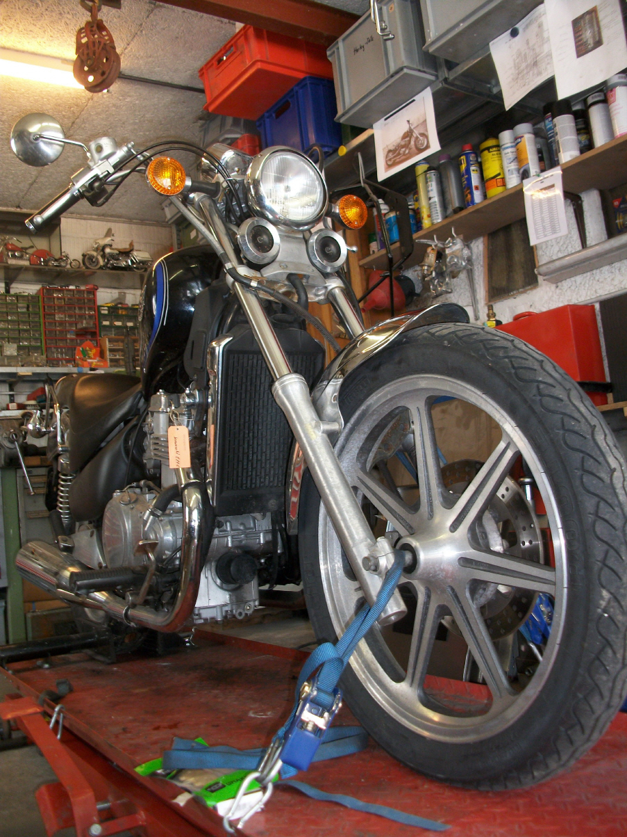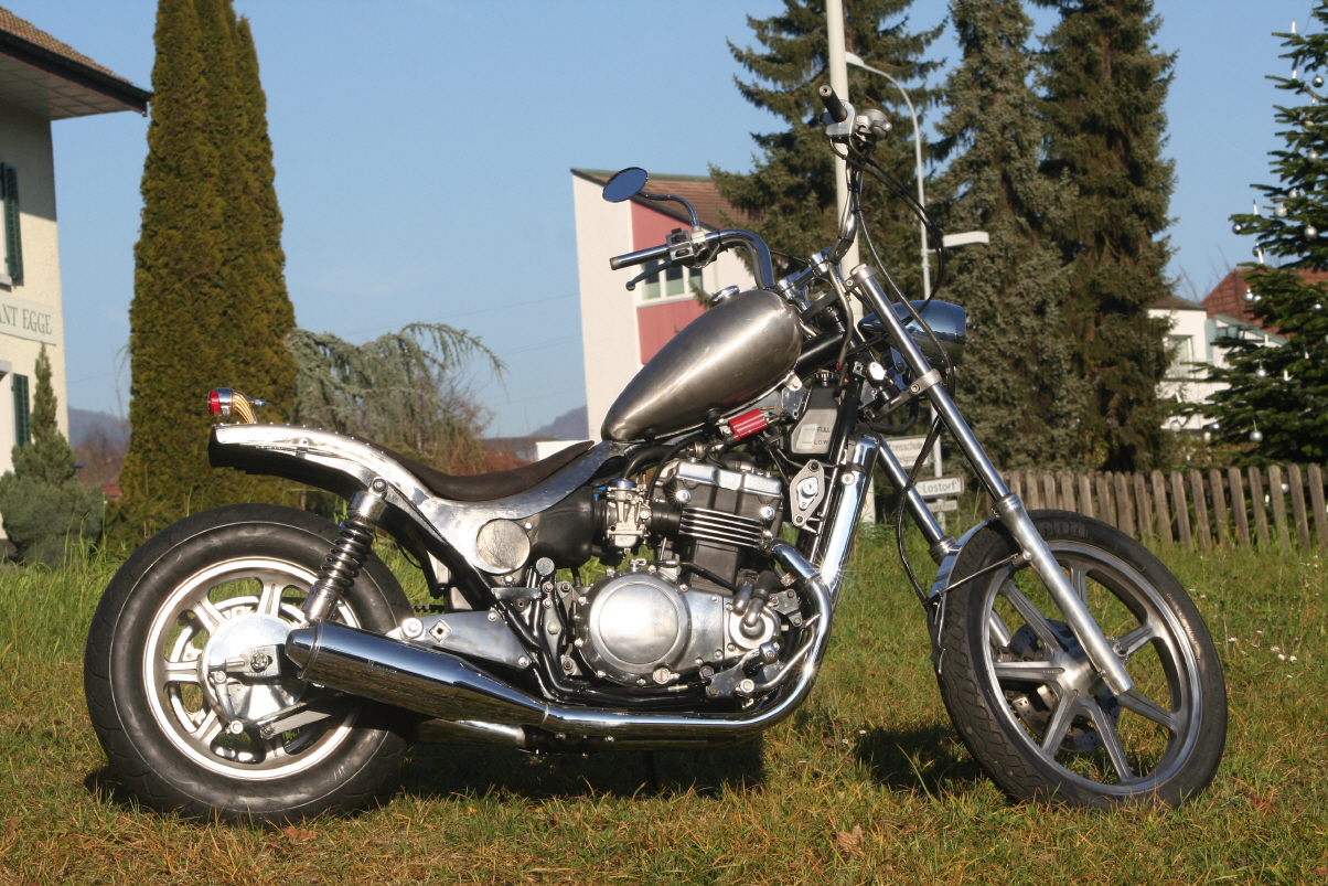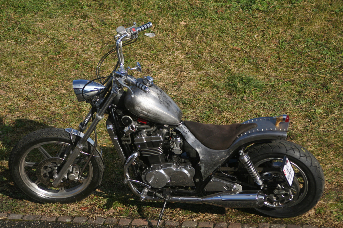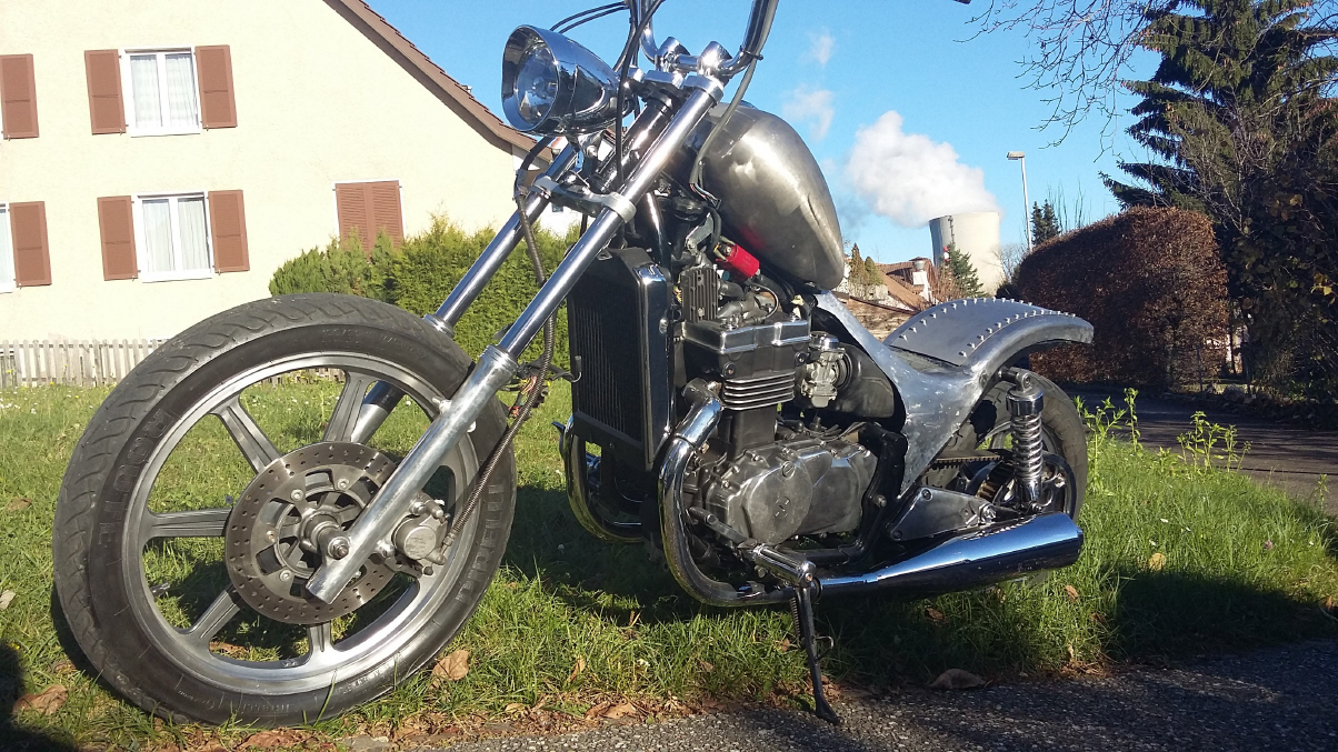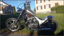 |   | Nun widme ich mich der Technik. Bevor ein Umbau realisiert wird muss da Bike technisch i.o. sein, sonst ist die Enttäuschung nacher gross wenn der Bock nicht richtig läuft und Du hast so viel Arbeit investiert. Erster Schritt, die Kopfdichtung. Die Kawa hat beim Testlauf ziemlich viel weissen Rauch abgesondert. Hab die ganze Nachbarschaft eingenebelt. Also muss die Kopfdichtung ersetzt werden.