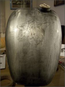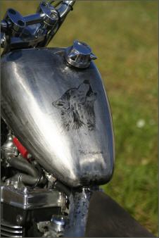 Das Metall ist grau und ein Wolf würde gut auf den Tank passen.