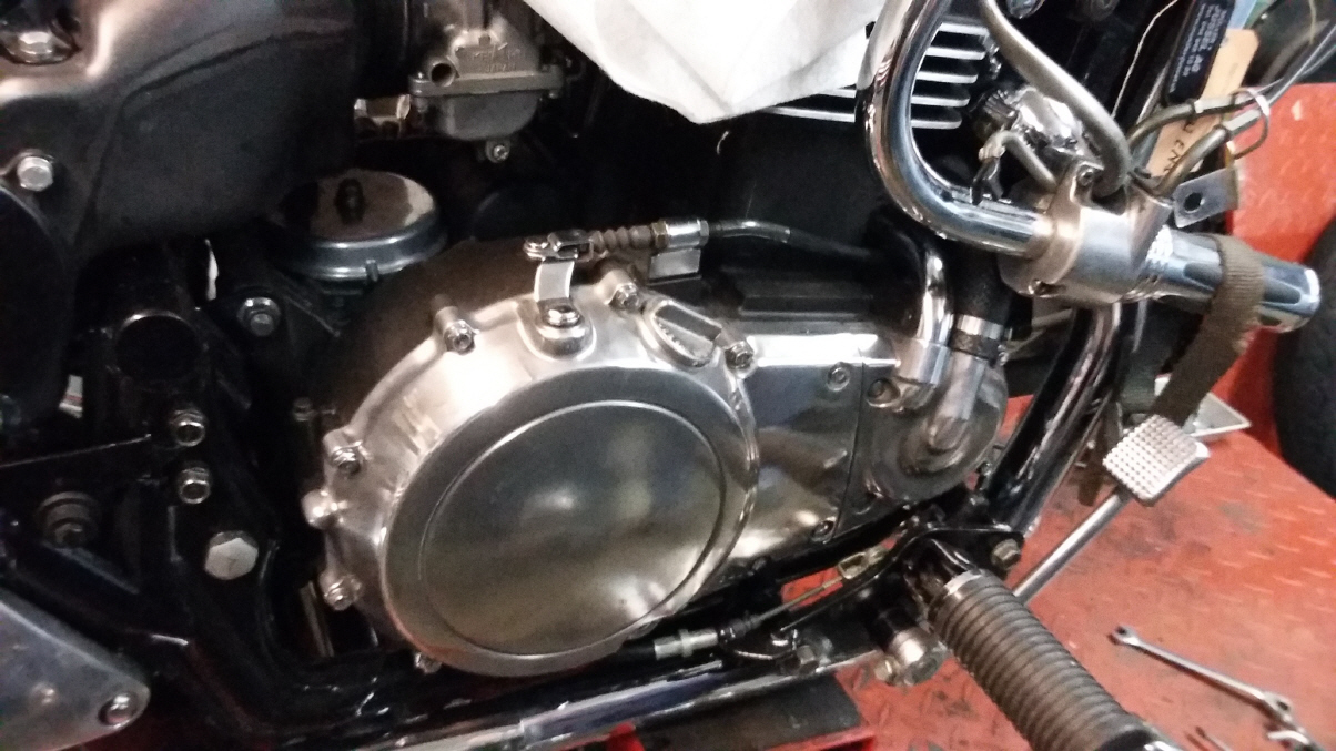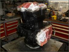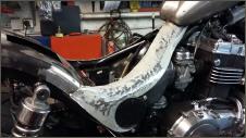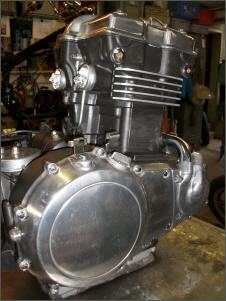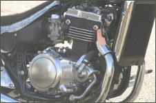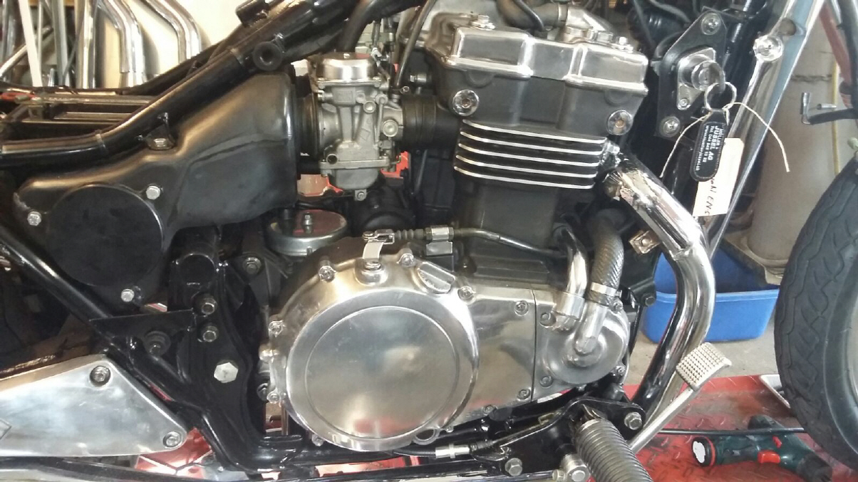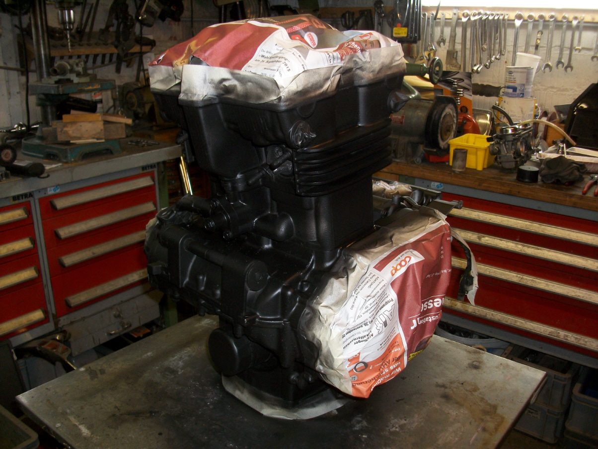 |   | Bei der Gelegenheit mache ich gerade noch ein bisschen Motorkosmetik und lackiere den Block schwarz. Auch am Rahmen ist jetzt alles zugänglich und ich kann alles wieder auf Vordermann bringen. Es packt mich regelrecht, ich kann mich nicht mehr bremsen und reinige schlussendlich jedes Teil und brings wieder zum glänzen. Das Bike wird immer schöner. |