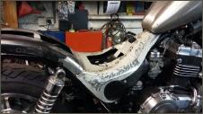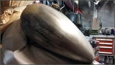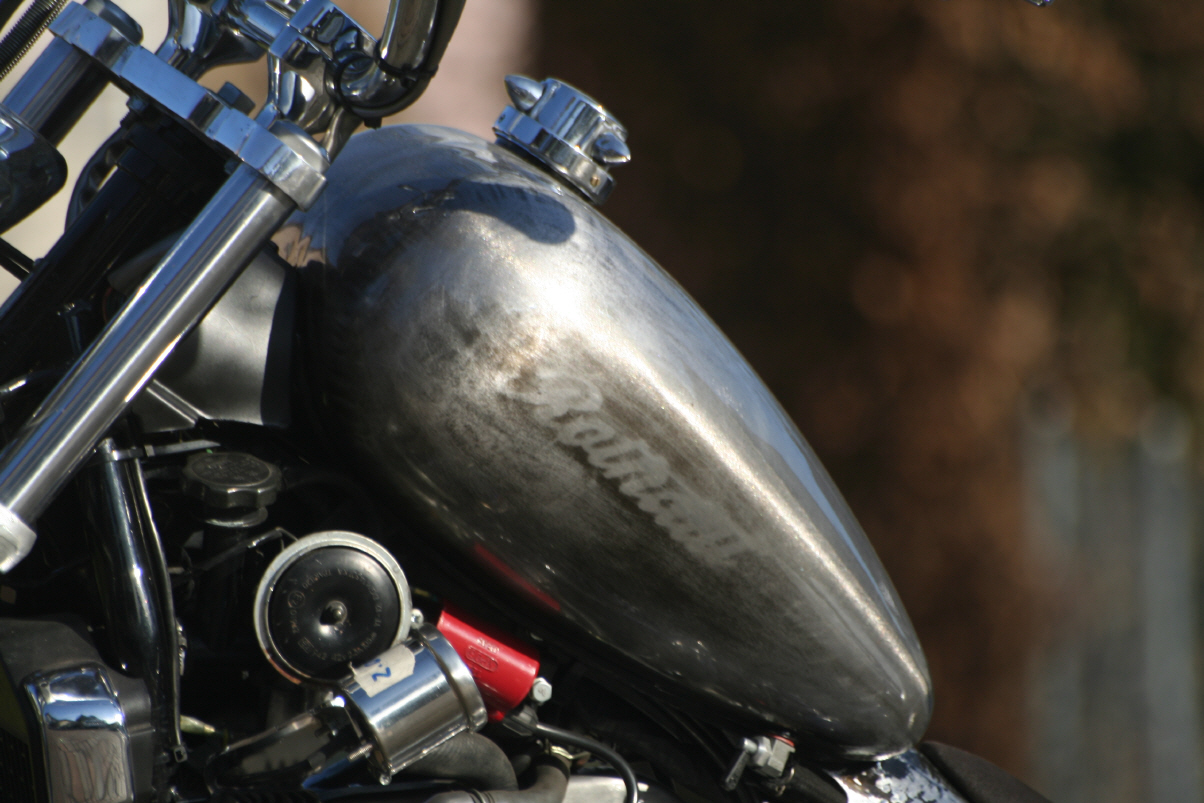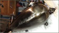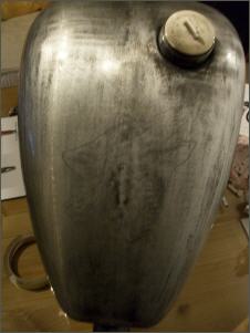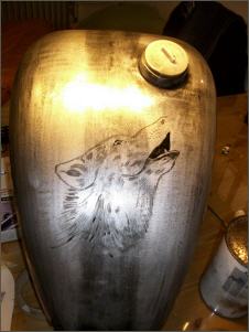 "Nacked Steel" nennt man das. Um die Konturen hervorzuheben lackiere ich die Blechteile mit schwarz. Beim Tank lege ich einfach eine ROTHAUT-Schablone auf. Danach wird alles wieder abgeschliffen. Nein falsch, nicht alles. Die Konturen und Vertiefungen bleiben schwarz. Beim Schriftzug lasse ich die Ränder stehen. Das gibt einen genialen Effekt.