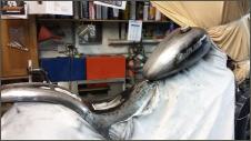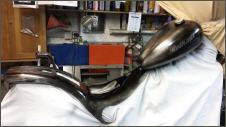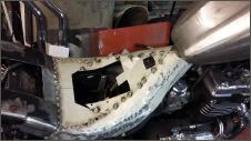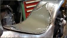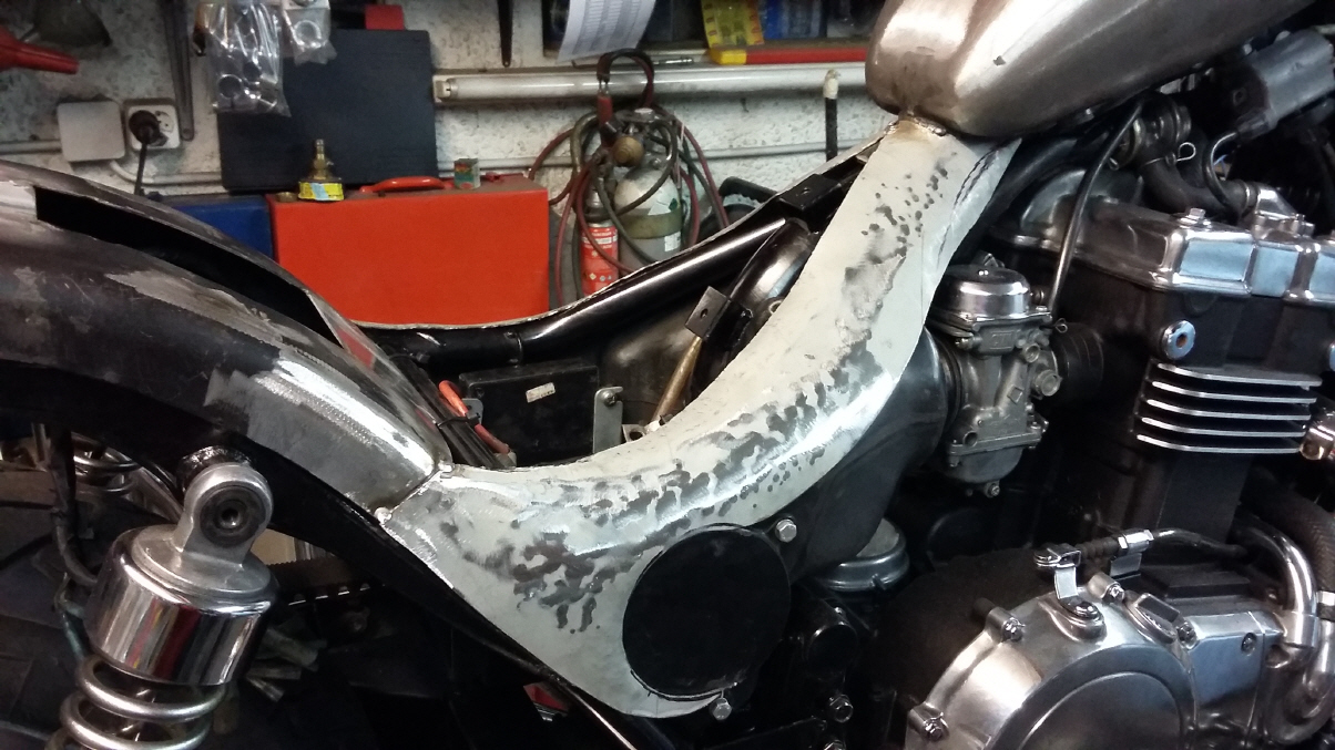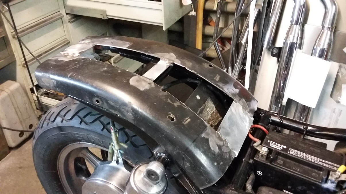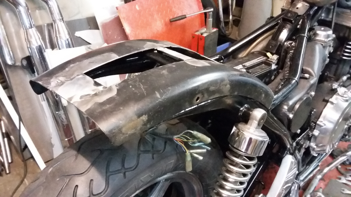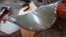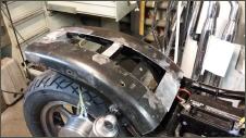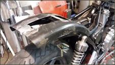 |   | Aus einem alten Schutzblech fertige ich einen Heckfender. Das Schutzblech ist zu schmal und wird deshalb längsweg, in zwei Hälften zertrennt. Jetzt kann ich es genau so anpassen wie sie mir gefällt. Danach hefte ich es an drei Stellen zusammen.