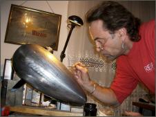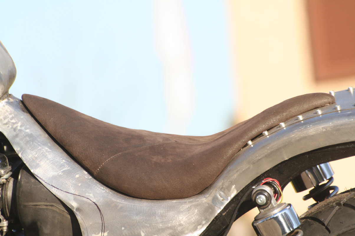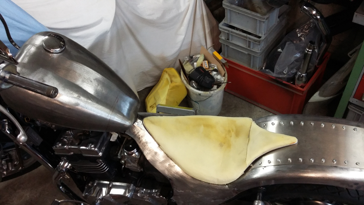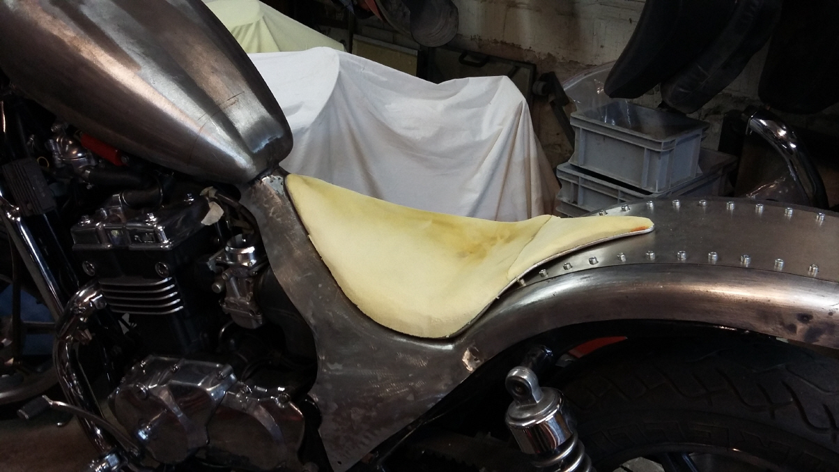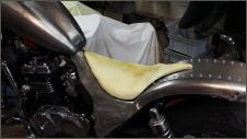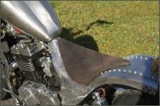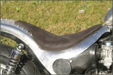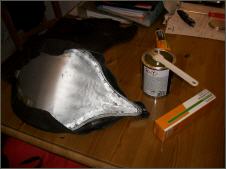 |   | Für den Sattel fertige ich zuerst eine Sitzpfanne, die ich mit einem Rundstahl umrande, damit das später aufgeszogene Leder nicht einreisst. Dann wird der Schaumstoff zugeschnitten, aufgeklebt und in Form gebracht.
