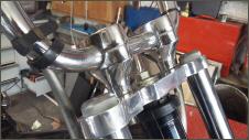 |   | Frontfender ist vielleicht etwas übertrieben. Aus einem Alustreifen fertige ich ein "Schutzblech". Mit dünnen Metallbügeln befetige ich es, so dass die Halterung, die Optik nicht stöhrt. Aber nur ein Streifen darf es nicht sein, nein ich muss natürlich noch eine Form geben.